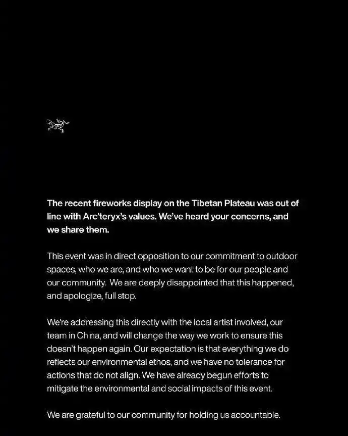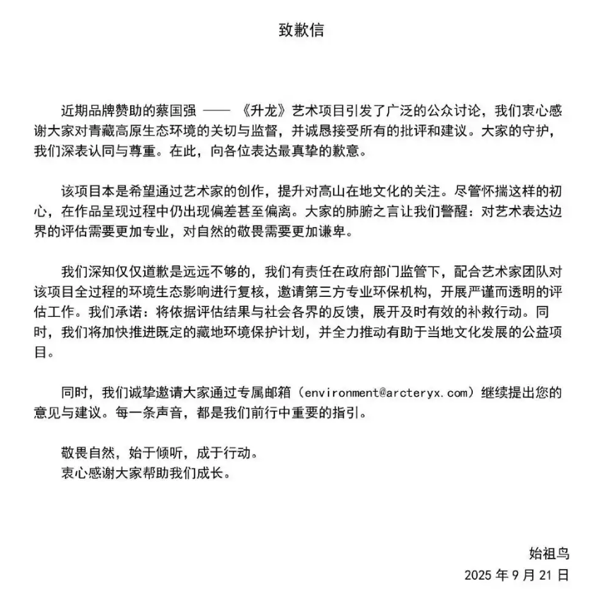 9月21日,始祖鸟ARCTERYX在国内社媒平台发致歉信,承诺在政府监管下,配合团队复核项目生态影响,邀第三方评估并依结果补救,同时推进藏地环保计划与文化公益项目。