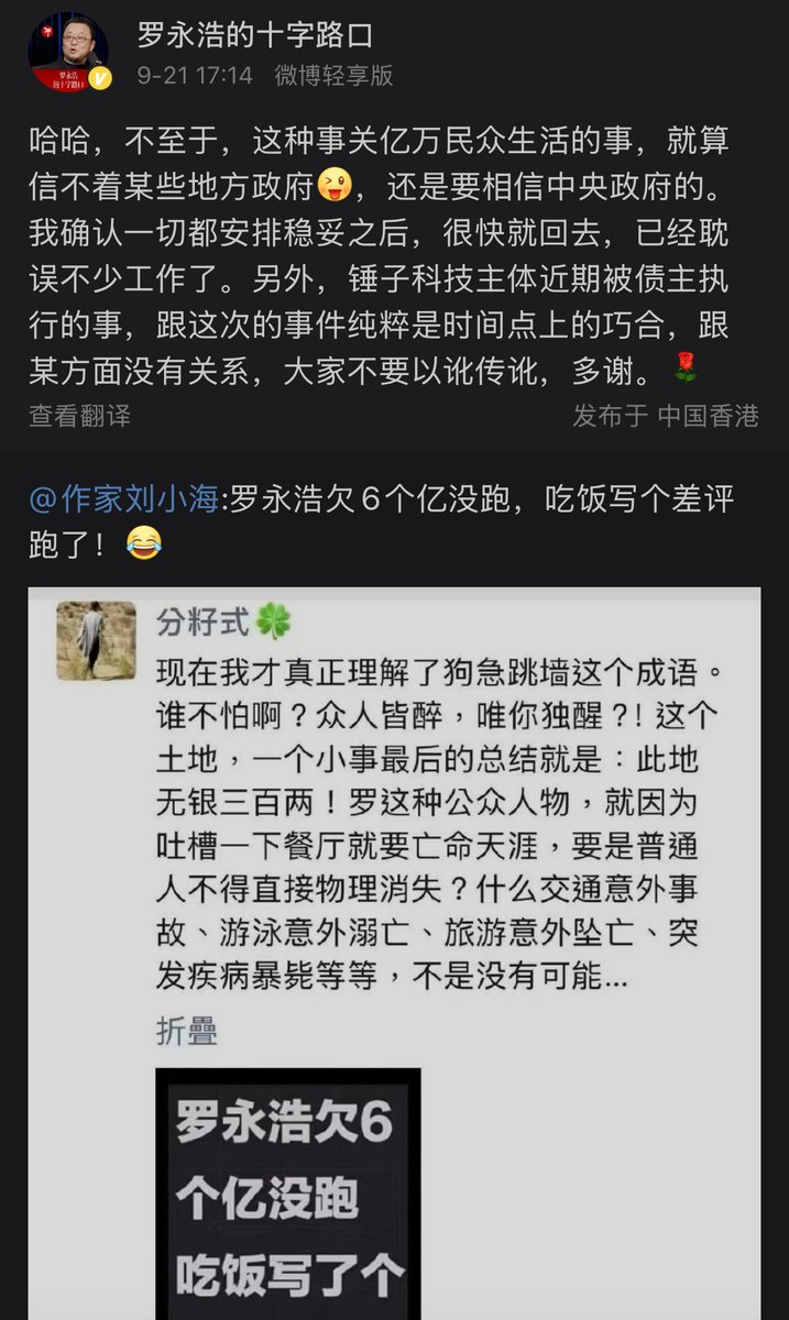 罗永浩在香港发布微博回应西贝预制菜事件:一是提及某件关乎亿万民众生活的事,即便对部分地方政府不信任,仍相信中央政府,待确认相关安排稳妥后会尽快返回;二是澄清锤子科技主体近期被债主执行一事,强调其与当前所涉事件仅为时间巧合,无关联,呼吁公众勿以讹传讹。
