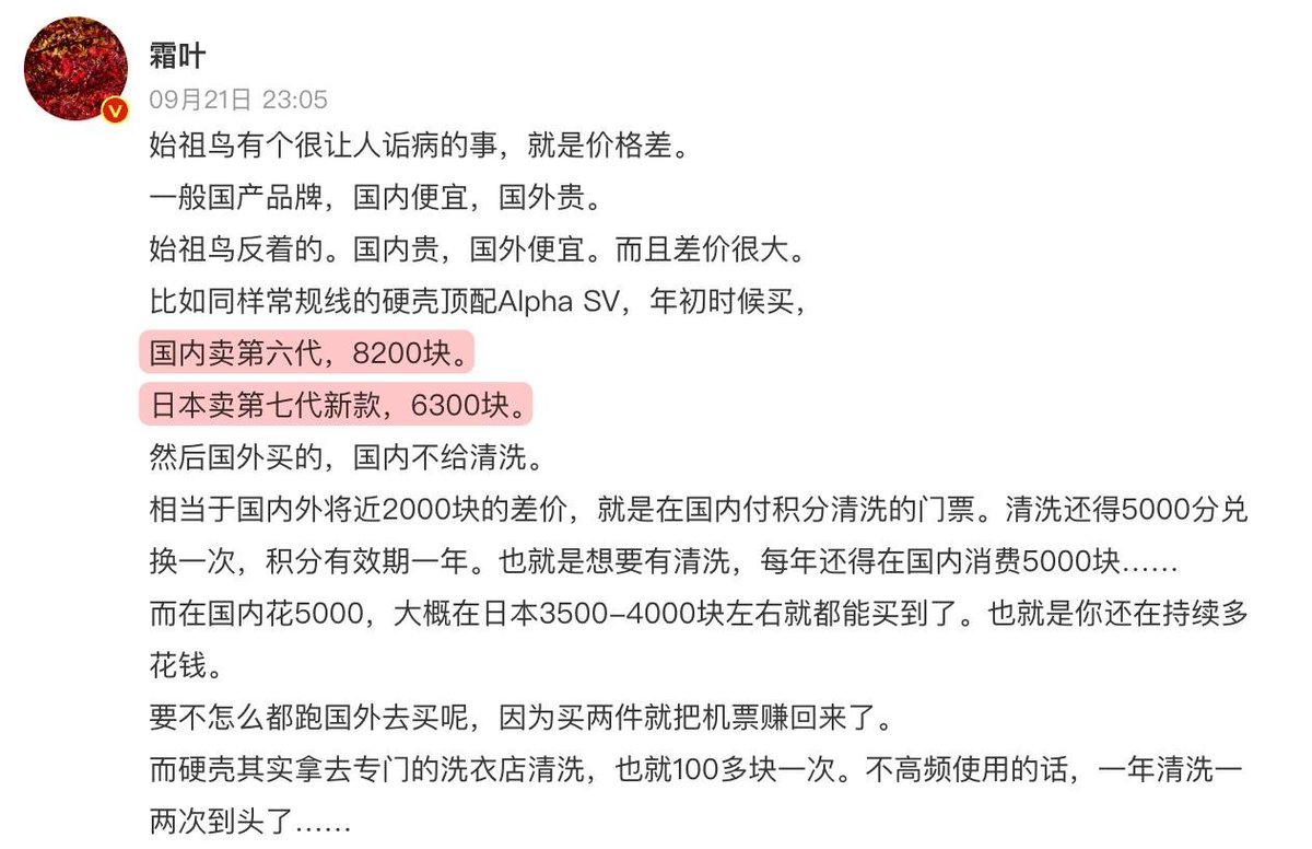 9月21日,有网友在微博曝光始祖鸟国内外区别对待消费者,同一款产品国内价格要比国外高出不少。