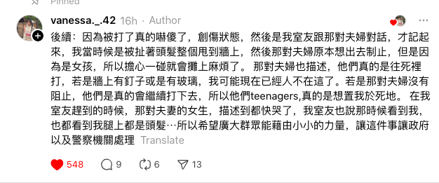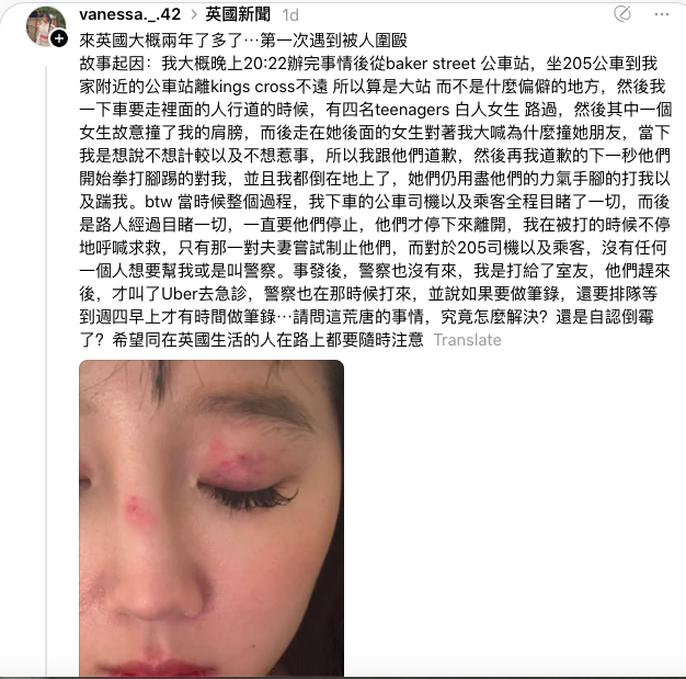 这个妹妹前天晚上在英国坐公交车下车时,无端地被四个白人女性殴打。太令人震惊和愤怒!这是赤裸裸的种族歧视,没想到英国也有白垃圾!