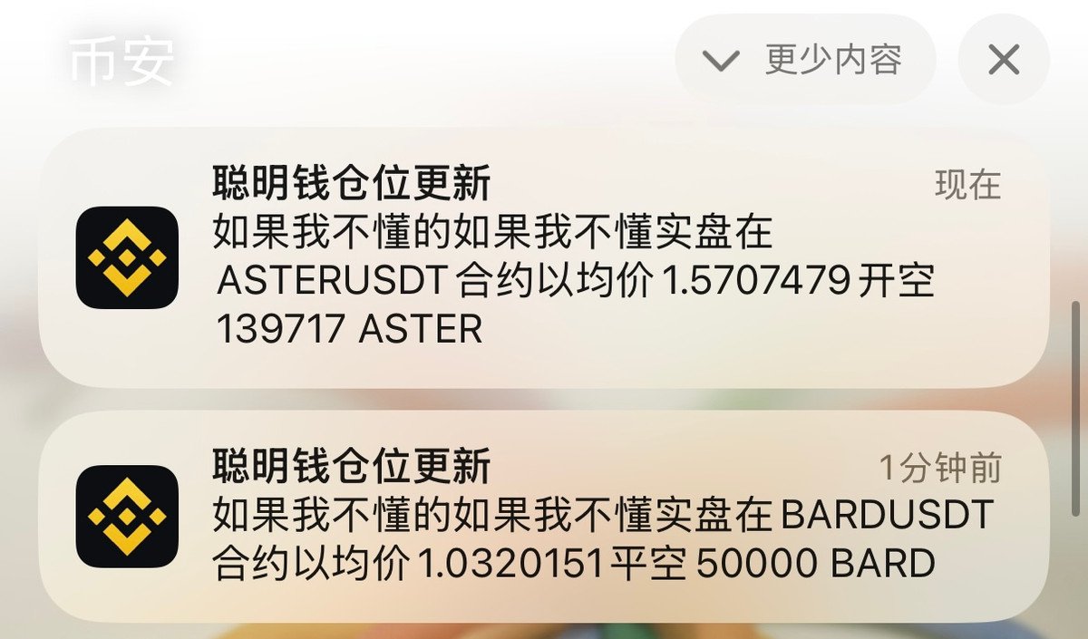 币安交易联盟团队赛排名第一的合约大佬「如果我不懂」 又开始交易了💡▶︎ $1.03 平空 5 万枚 $BARD▶︎ $1.57 开空 13.9 万枚 $ASTER ,约 22 万美元不过目前仓位和操作记录还是隐藏状态,只有在币安合约聪明钱订阅状态下才能收到推送: