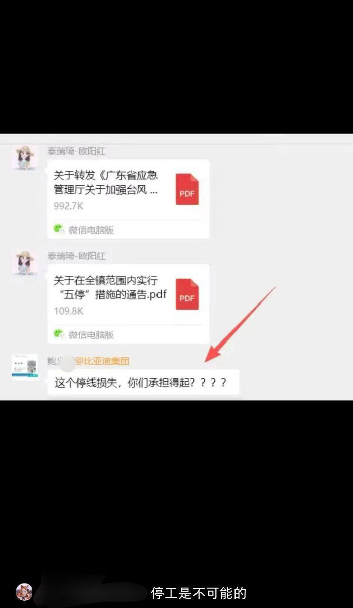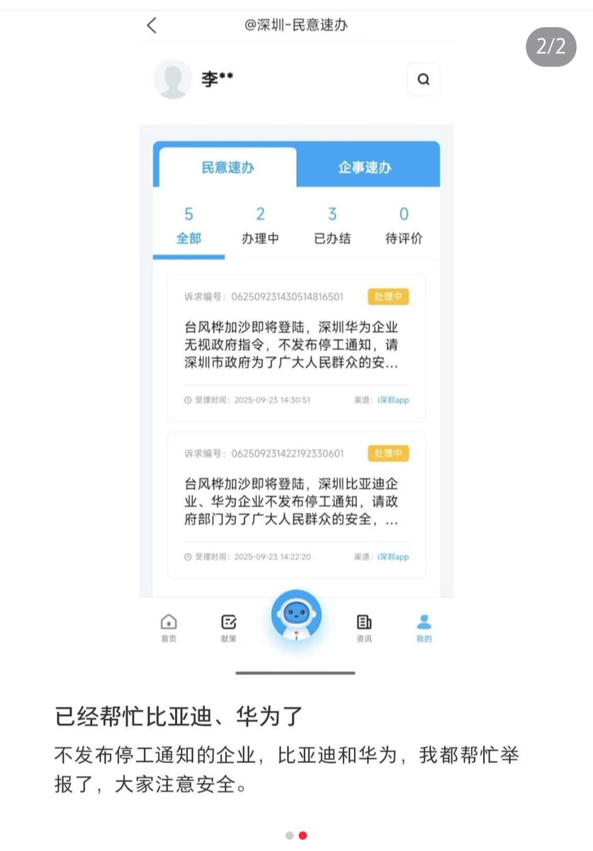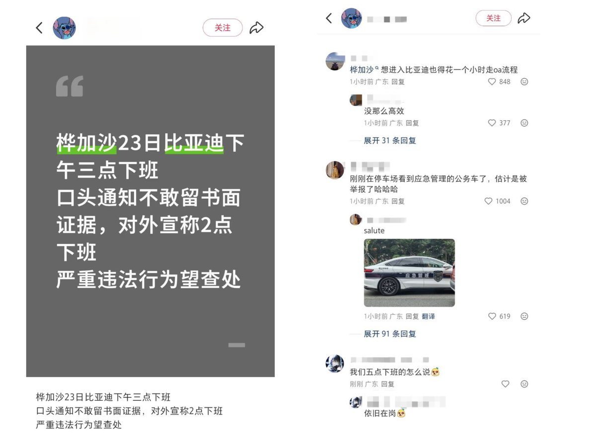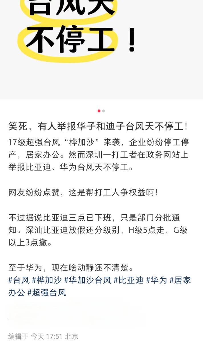 9月23日,有网友在小红书爆料,比亚迪在9月23日因台风“桦加沙”实际通知下午3点下班,却仅以口头形式传达,不敢下发书面文件,对外仍声称“2点下班”。 另有员工透露,深圳比亚迪实行分级撤离制度,G级员工3点下班,H级则需等到5点。 还有人直接在政务平台发帖举报比亚迪台风天不停工。有照片显示,有应急管理公务车已抵达停车场,疑似相关部门接报后已介入调查。
