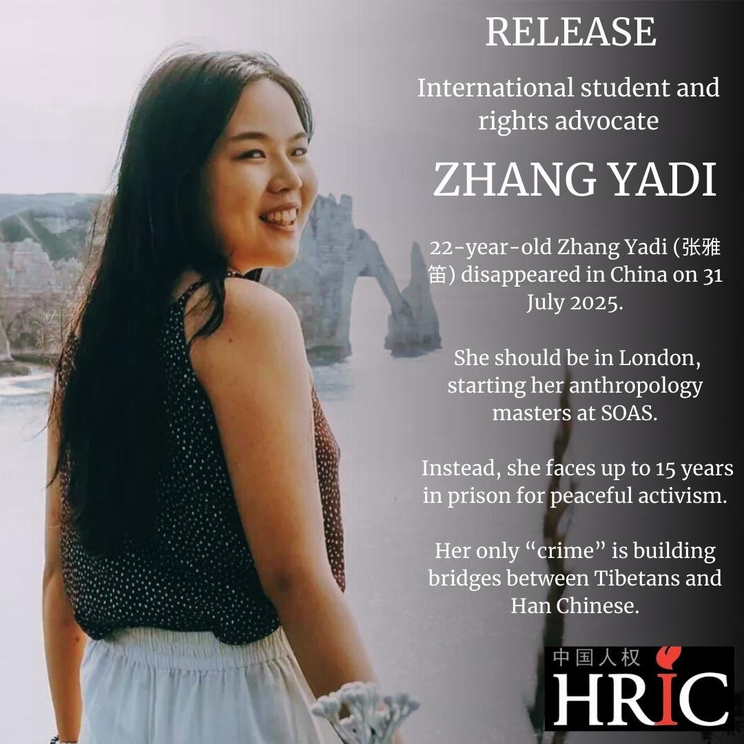 释放张雅笛:跨文化对话不是犯罪。中国人权组织呼吁中国当局立即无条件释放22岁藏族权利倡导者张雅笛(Tara),她仅因编辑中文平台促进藏汉民族对话,即被控”煽动分裂国家、破坏国家统一”,面临5至15年重刑。 张雅笛原为法国留学生,精通中文、藏语、英语与法语,曾获法国政府奖学金,原计划9月赴伦敦亚非学院攻读研究生。今年暑假回国探亲期间,于7月31日在云南香格里拉被捕,现被关押于湖南长沙。https://t.co/ytAOeSPOQz