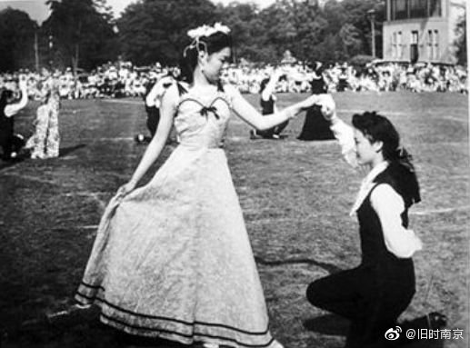 1948年,南京,金陵女子大学体育舞蹈表演盛会上,学生表演法国宫廷舞。