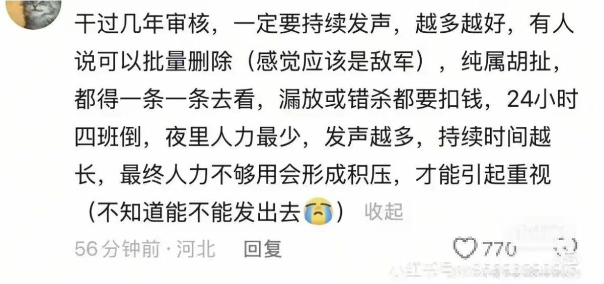 9月23日,针对大量关于于朦胧事件的帖子和评论被“秒删”的现象,有一位曾从事平台审核工作的网友表示,所谓的“发声太多会被批量删除”的说法是误导。目前,平台的内容审核仍主要依靠人工,而不是算法,每条都要一一过审,任何遗漏或误判都要扣钱,24小时四班倒,尤其夜班人手最少。持续发声越久,越容易