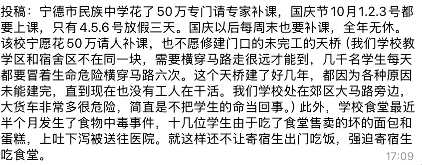 网友投稿福建省,宁德市民族中学花了50万请专家补课,国庆节10月1日至3日连续上课,仅4日至6日放假三天。节后每个周末也安排补课,几乎全年无休。