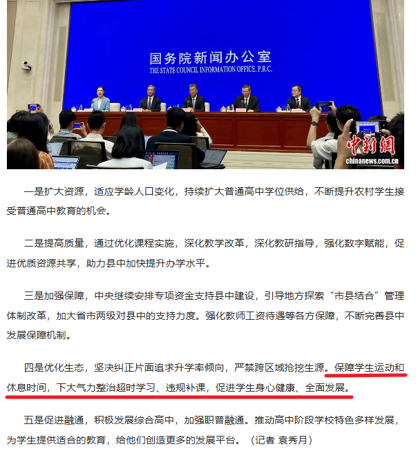 9月23日,教育部部长怀进鹏在国新办举行发布会上介绍,目前,“县中振兴行动计划”已正式实施。国家将采取五方面措施,全面提升县中办学水平,其中第四条:优化生态,坚决纠正片面追求升学率倾向,严禁跨区域抢挖生源。保障学生运动和休息时间,下大气力整治超时学习、违规补课,促进学生身心健康、全面发展。
