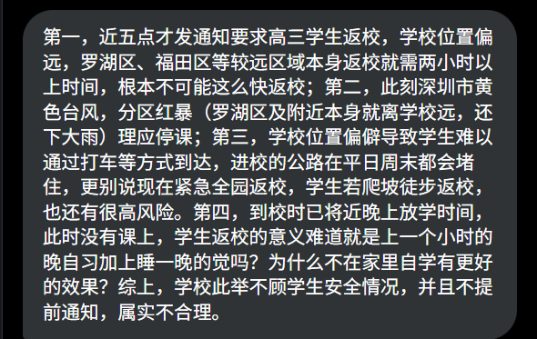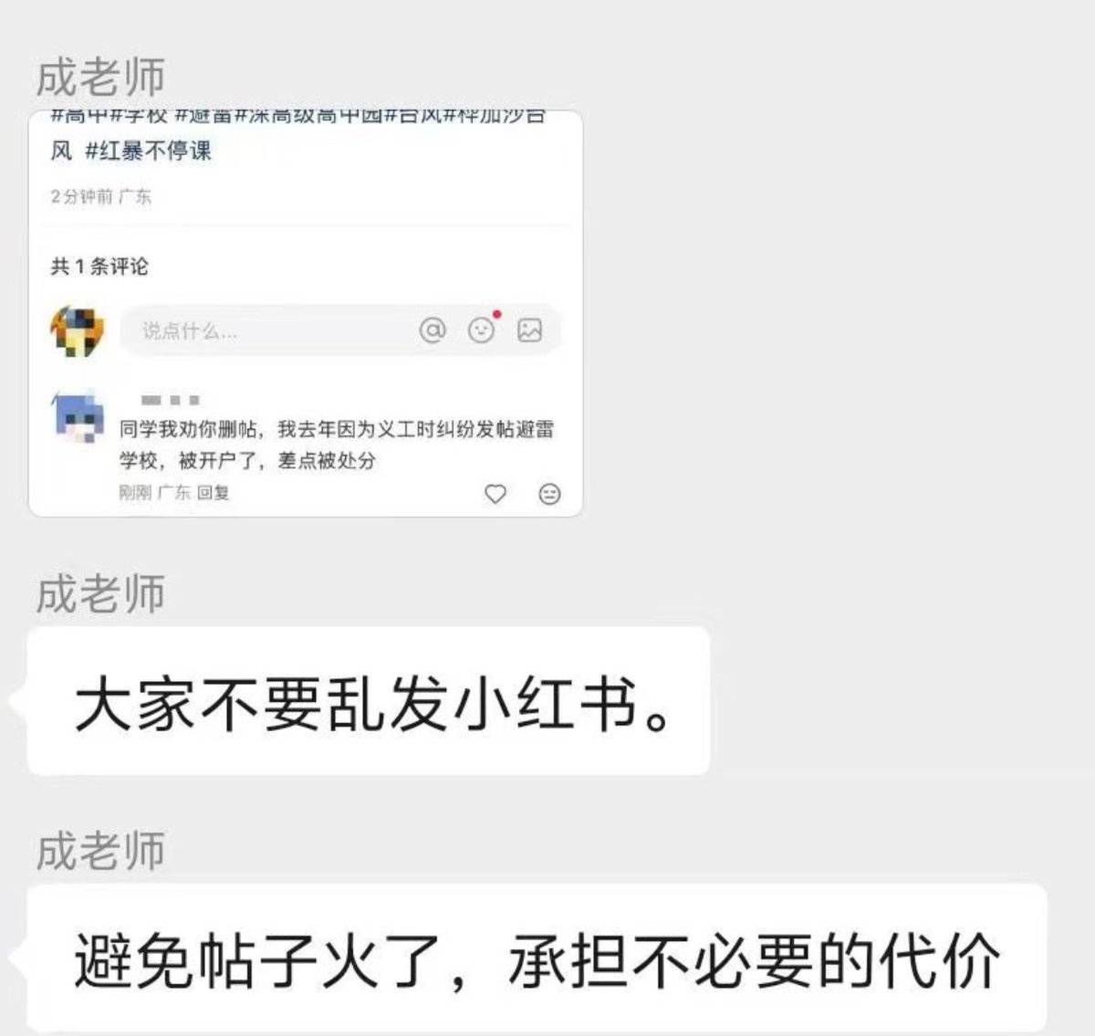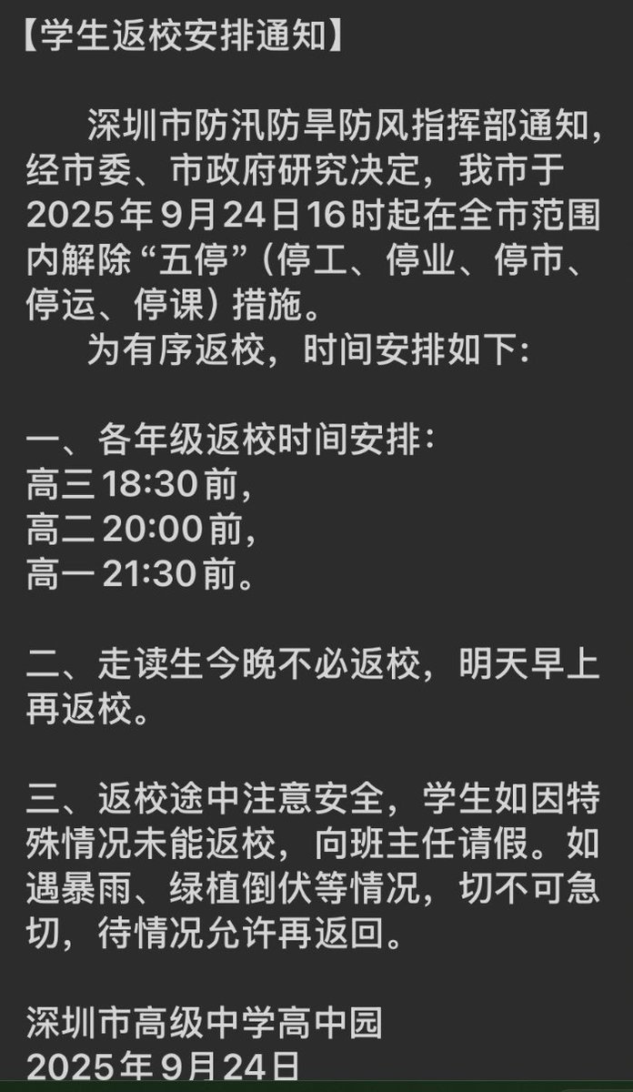 深圳市高级中学高中园 学生投稿9月24日,学校在红色暴雨预警的情况下,要求高三学生在一个半小时内返校。同时有老师在微信群威胁学生不要乱发小红书,避免帖子火了,承担不必要的代价。