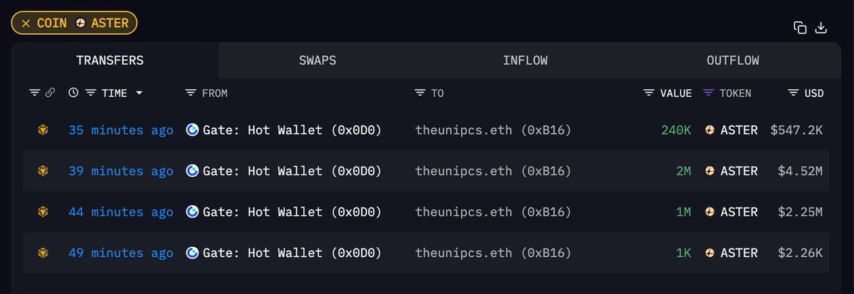 曾交易 $MAGA 获利 60 倍的聪明钱( 首次建仓 $ASTER 💡过去 1 小时地址 theunipcs.eth 从 #Gate 提出 324.1 万枚 ASTER,价值 731.9 万美元,提出价格 $2.25(实际成本不可知)钱包地址本文由 #Gate 大门交易所 | 赞助