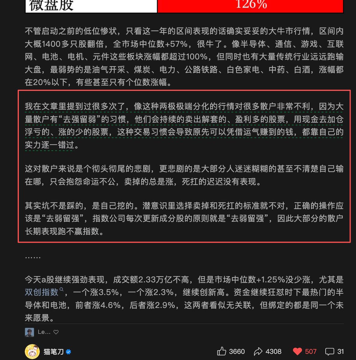 GMGM 早起刚好看到猫笔刀的文章,这段关于散户心理的话讲的非常准确,给大家共享警醒一下: “大量散户有“去强留弱”的习惯,他们会持续的卖出解套的、盈利多的股票,用现金去加仓浮亏的、涨的少的股票 潜意识里选择卖掉和死扛的标准就不对,正确的操作应该是“去弱留强”,指数公司每次更新成分股的原则就是“去弱留强”,因此大部分的散户长期表现跑不赢指数” 币虽然节奏比股票快很多,但基本逻辑类似。如果你习惯性的涨了就卖,亏了扛单,到后面手里只会留下一堆被庄家弃盘的垃圾。