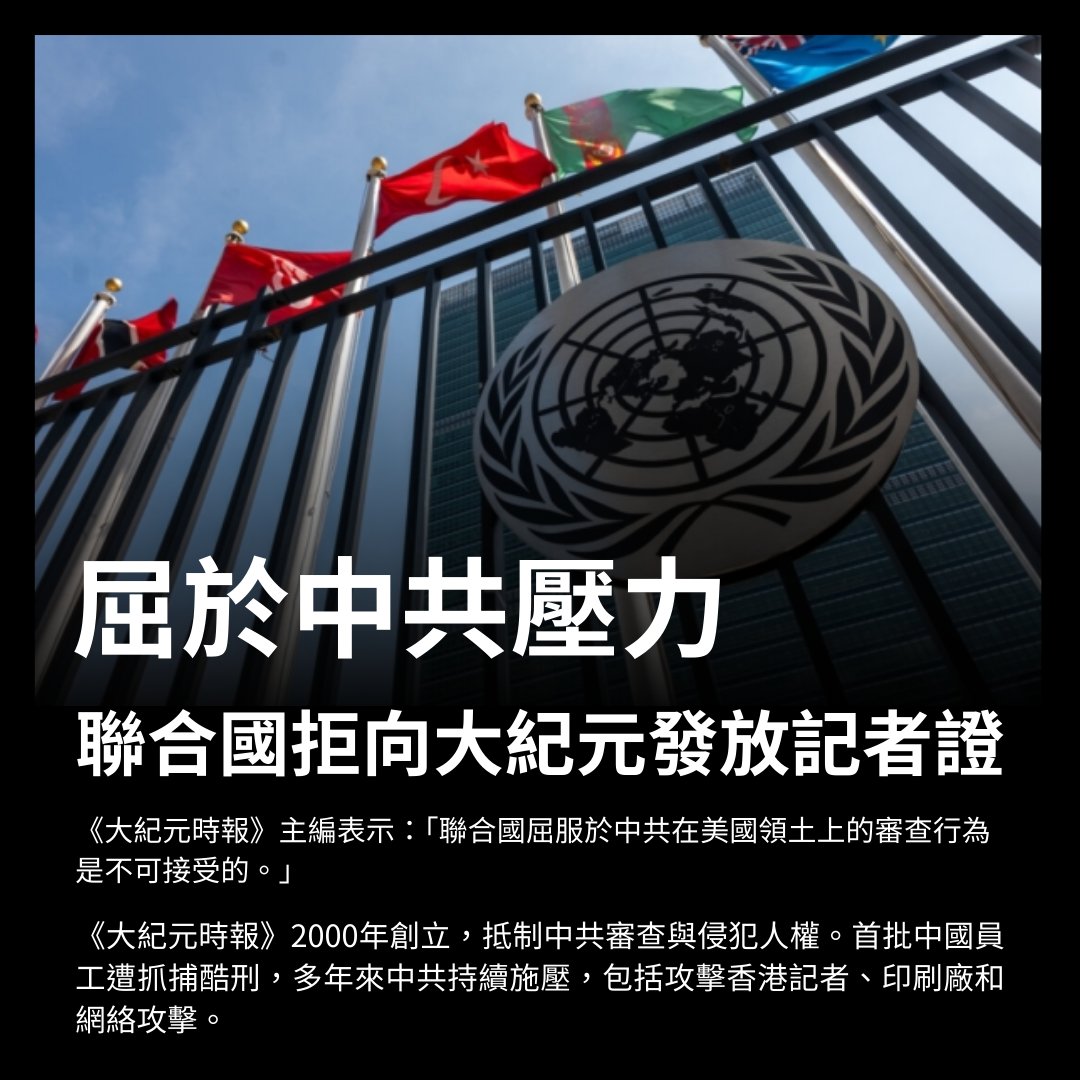9月22日,聯合國再次拒絕向《大紀元時報》和《新唐人電視台》記者發放採訪證,聯合國新聞官員以中國代表團的投訴為由,未給詳細解釋,限制了他們在中國代表出席的活動中進行報導。 多年來中共施壓這兩家媒體,包括網攻與員工抓捕。海外媒體與美國政界批評聯合國受中共影響。《大紀元》表示將繼續捍衛新聞自由!