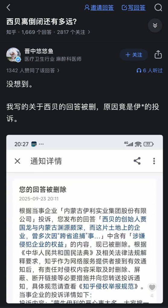 9月25日,网友在知乎回答“西贝离倒闭还有多远”时,相关回答竟被伊利以涉嫌侵犯企业权益为由投诉下架。