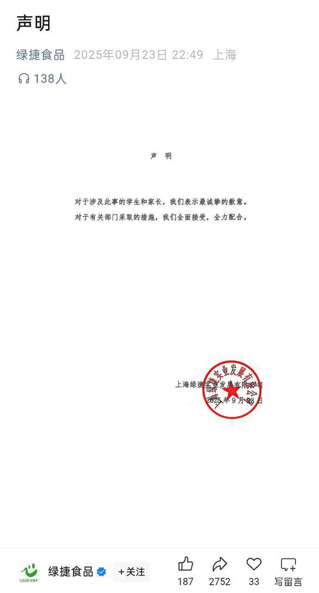9月23日,上海绿捷食品发布一则简短的声明:“对涉及此事的学生和家长,表示最诚挚的歉意;对有关部门采取的措施,全面接受,全力配合。”