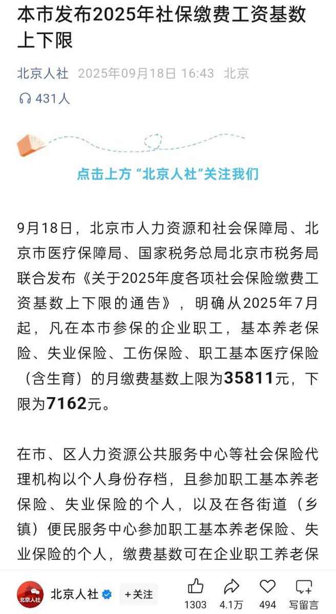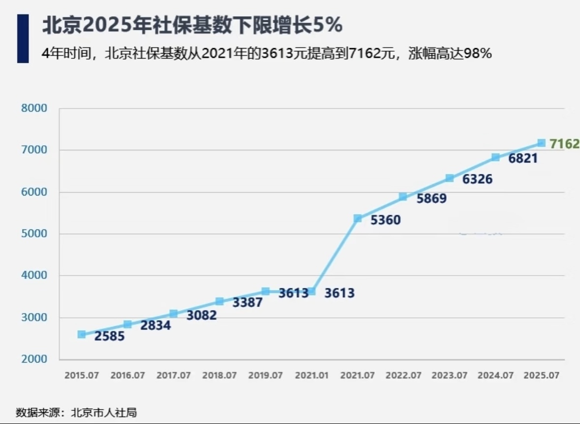 9月18日,北京公布了2025年社保缴费工资基础上下限,上限为35811元,下限为7162元。2020年的最低基数是3613元,北京这6年涨幅近100%,一骑绝尘。同比,这6年上海涨幅50%。