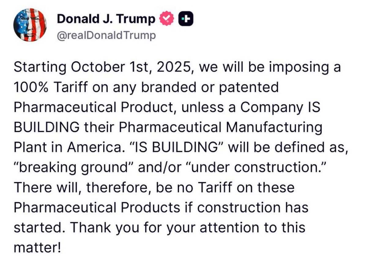 川普宣布:除非药品生产商在未来 5 天内开始在美国建造新工厂,否则将对药品征收 100% 的关税。破土,动工都算开始建厂,可以例外对待。今天他还宣布5天后- 对厨柜和浴室柜的产品征收50%的关税- 对软垫家具等川普征收30%的关税