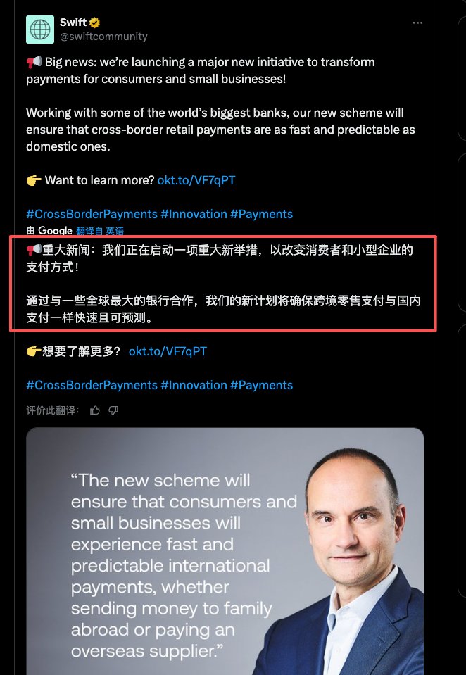 如果正式官宣的话,那将是一个非常大的利好,因为这意味着区块链和稳定币真正意义上已经开始倒逼 SWIFT 这样的跨过支付巨头接受革命。