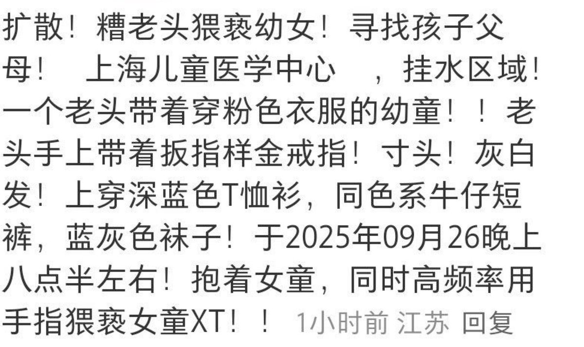 9月26日晚八点半,上海儿童医学中心,有网友举报称一名老人疑似“猥亵女童”。随后在评论区,有自称当事人亲属的网友称:老人是女孩的亲爷爷,让大家“不要再说”。