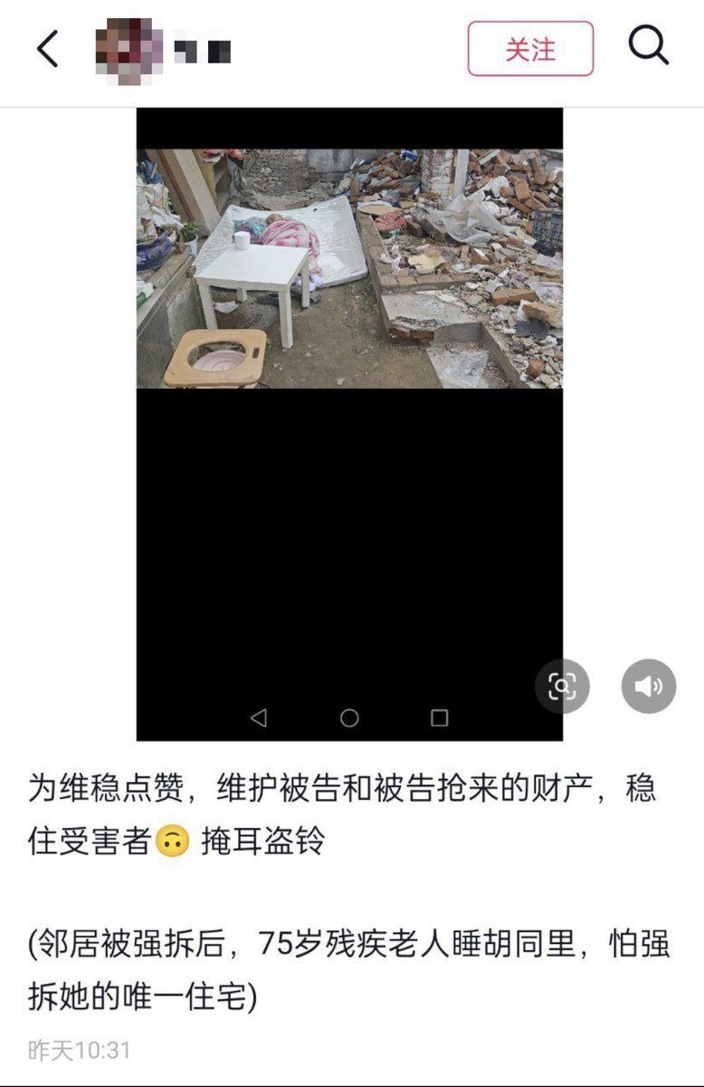9月24日,北京市海淀区田村半壁店后街心村98号,村民反映:自家唯一住宅于2024年9月5日被强拆,至今未获安置。邻居中一名75岁的残疾老人,因担心政府也会强拆其唯一住房,不敢回屋,只能露天睡在胡同里。