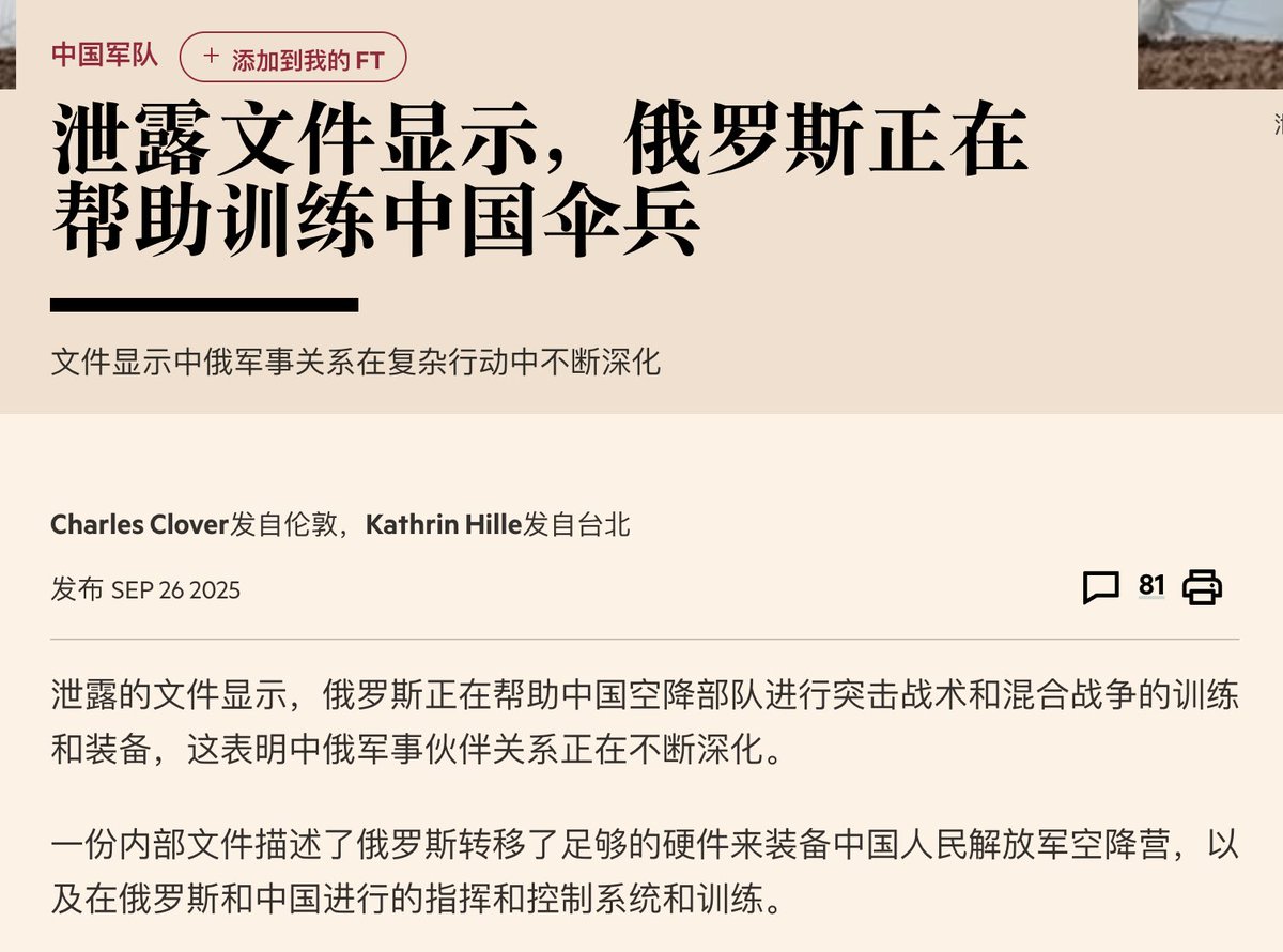 根据路透社和金融时报的消息显示中俄正在加强军事合作路透社消息,中国正在派遣无人机技术专家,帮助俄罗斯生产无人机而根据金融时报的消息,俄罗斯最近则在帮中国训练伞兵