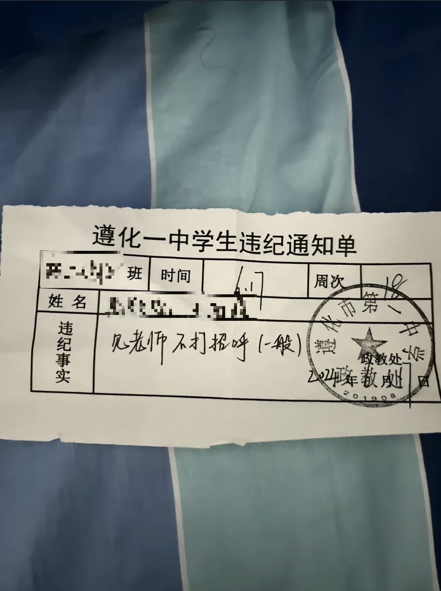 网友投稿近日,贵州遵义一中一名学生晒出自己曾经的违纪通知单,原因是“见到老师不打招呼”。