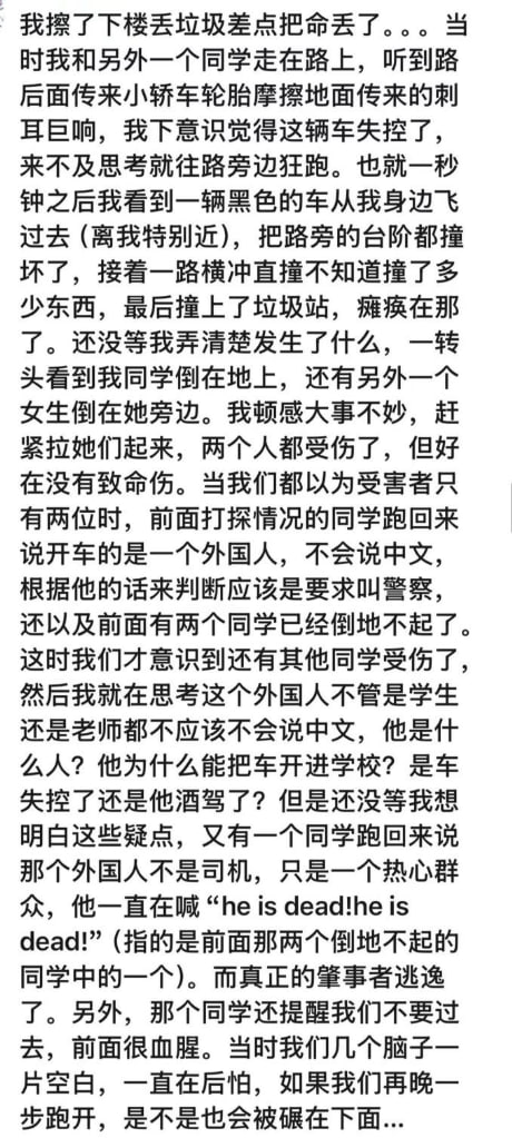 有目击者在朋友圈发文,截图如下。(因当时灯光昏暗,加之惊吓过度,目击者将车辆误认作“黑色”,实为蓝色宝马。)