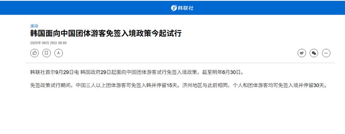 9月29日,据韩联社报道,韩国面向中国团体游客免签入境政策今起试行 ,免签政策试行期间,中国三人以上团体游客可免签入韩并停留15天。济州地区与此前相同,个人和团体游客均可免签入境并停留30天。
