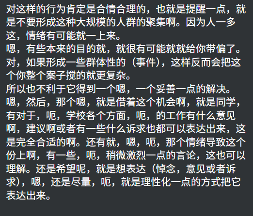 9月29日晚,华南理工大学的年级辅导员正在逐一走访学生宿舍,表示当前一切以警方最新通报为准。对同学们表达悲痛与悼念的做法表示理解,但不建议形成大规模聚集,以免情绪失控或引发群体性事件、让问题更复杂。
