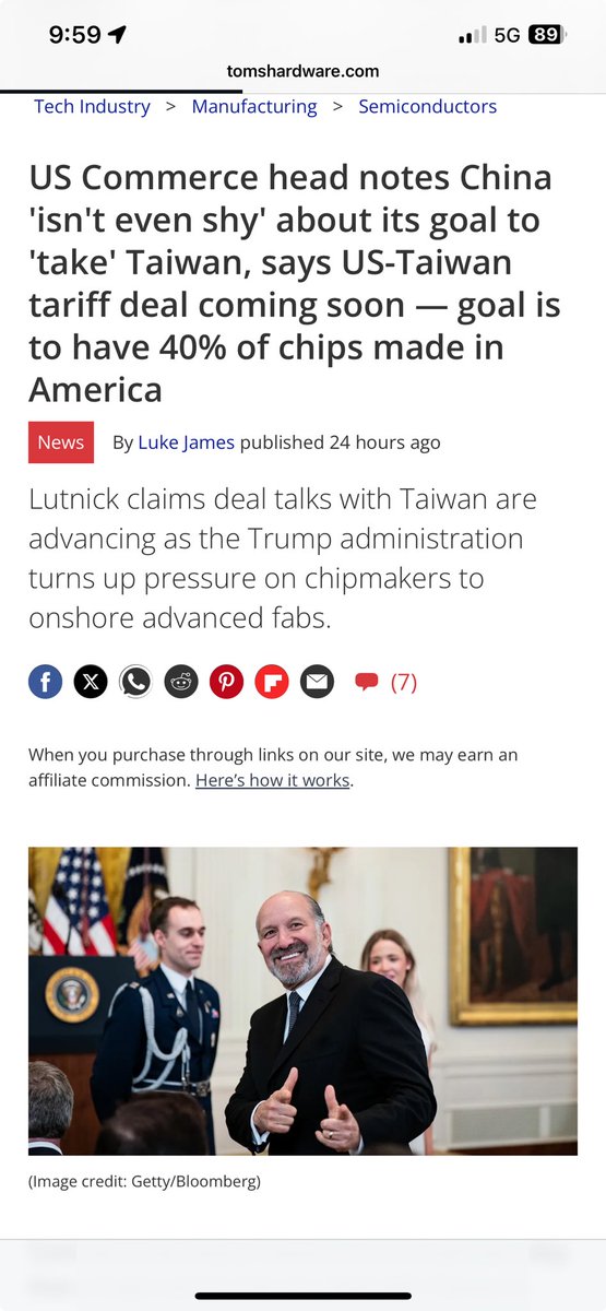 川普商务部长霍华德·卢特尼克:“中国人说,‘我们要拿下台湾。’他们甚至毫不避讳。”他说,正是这种威胁使得半导体制造业无法继续集中在“距离中国大陆80英里的岛屿”上。