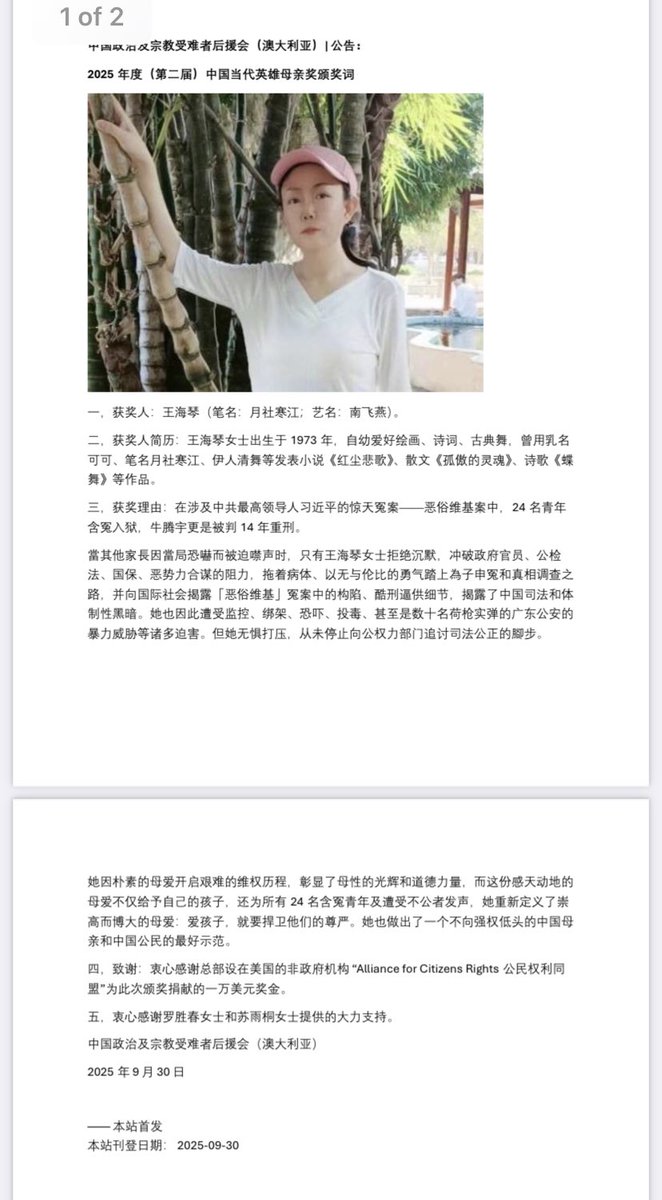 政治及宗教受难者后援会(澳大利亚)| 公告: 2025 年度(第二届)中国当代英雄母亲奖颁奖词