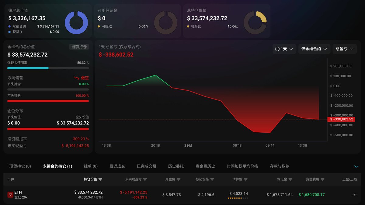 这位 20x 做空 $ETH 的老哥还在扛单,已浮亏高达 519 万美元持仓 8000 ETH(3360 万美元),开仓价 $3,547.73,清算价 $4,523.14,距离现价还有 300 多刀的空间;不过他的保证金利用率只有 50.32%,是有能力继续抗的传送门 👉