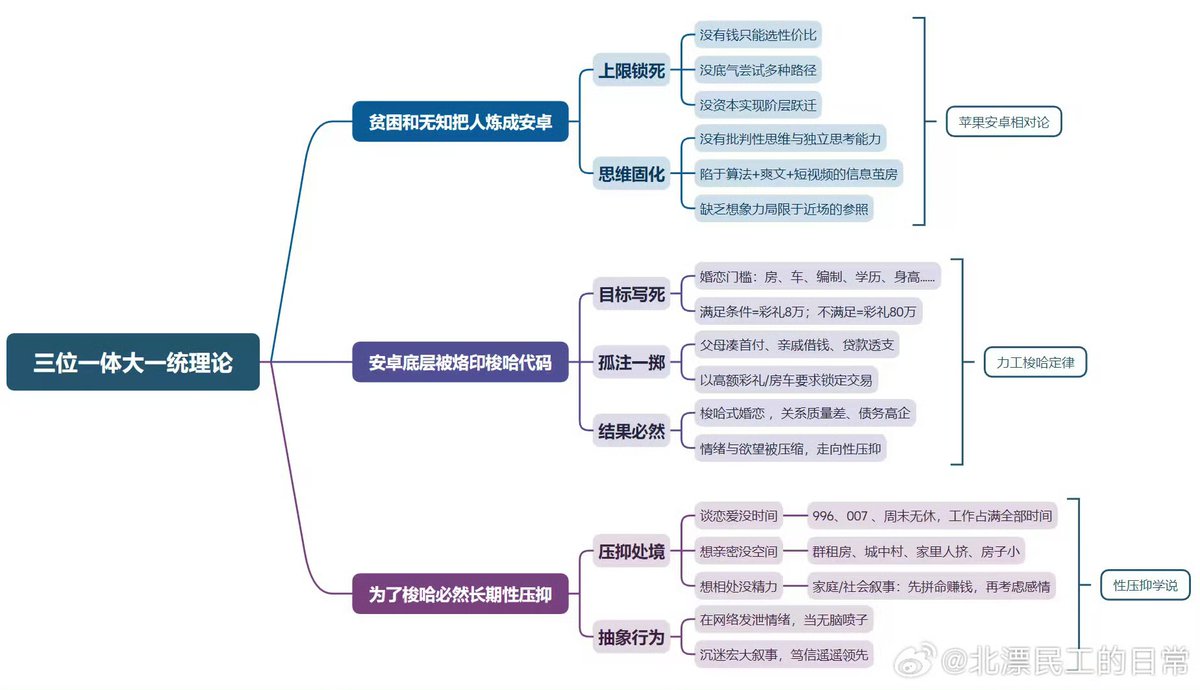 大一统理论(安卓苹果相对论,力工梭哈论,性压抑论)思维导图。