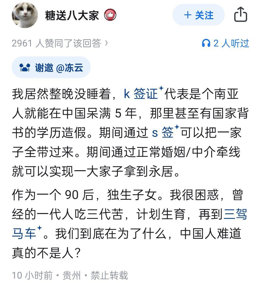 网友们社交媒体发声反对K签证。网友直言:我支撑K签证,但是有个前提条件,这些来的外国人只能在北京内生活工作,禁止到别的城市乱逛不可出京。 还有网友质疑:外国人轻轻松松就能带着一家子拿到中国永居,作为一个90后,独生子女。我很困惑,曾经的一代人吃三代苦,计划生育,再到三驾马车。我们到底在为了什么,中国人难道真的不是人?