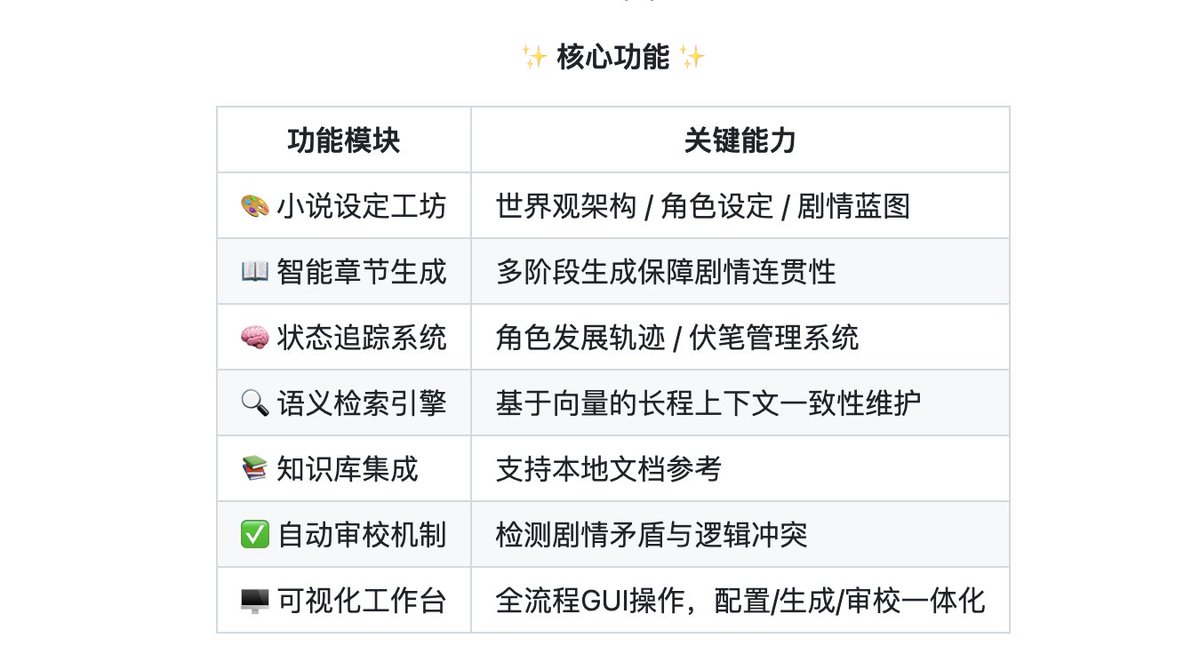 一款长篇小说自动生成工具:AI_NovelGenerator,解决了长篇小说创作中保持一致性的痛点,自动衔接上下文、伏笔 其通过模块化功能,来对小说创作过程进行精细化控制 动笔前,可以先设定小说的世界观、核心角色、剧情蓝图、雷点暗线等 智能章节生成,设有状态追踪,系统的管理角色发展轨迹和伏笔的埋设与回收 对已生成的内容进行检索,使长篇故事上下文保持一致性 自动审校,提供完整的图形界面,可以在一个窗口内完成配置、生成、编辑、审校所有操作 #AI长篇小说工具