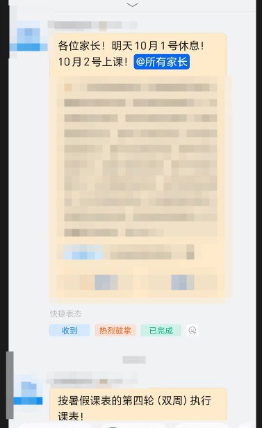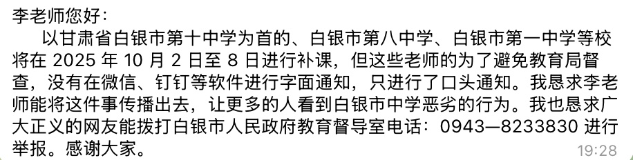 以甘肃省白银市第十中学为首的、白银市第八中学、白银市第一中学等校将在2025年10月2日至8日进行补课,但这些老师的为了避免教育局督查,没有在微信、钉钉等软件进行字面通知,只进行了口头通知。