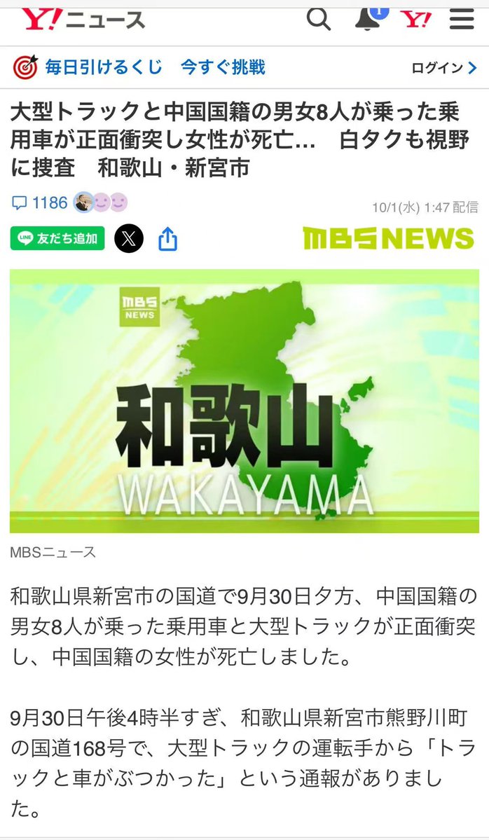 9月30日傍晚,在和歌山縣新宮市的國道上,一輛搭載著中國國籍8名男女的車輛與大型卡車正面相撞,一名中國籍女性死亡。搭載中國乘客的車輛疑似為「黑車」。