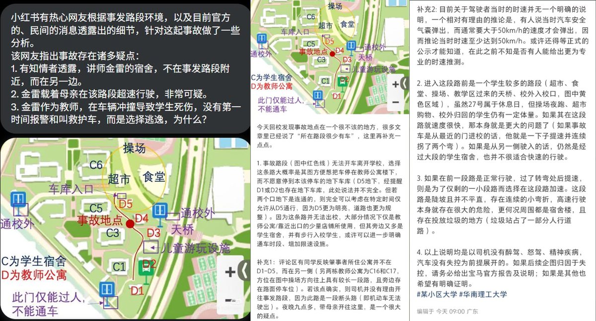 9月30日,小红书有热心网友根据事发路段环境,以及目前官方的、民间的消息透露出的细节,针对这起事故做了一些分析。 该网友指出事故存在诸多疑点: 1.有知情者透露,讲师金雷的宿舍,不在事发路段附近,而在另一边。 2.金雷载着母亲在该路段超速行驶,非常可疑。 3.金雷作为教师,在车辆冲撞导致学生死伤,没有第一时间报警和叫救护车,而是选择逃逸,为什么?