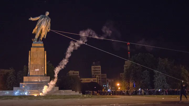 在波罗的海国家、波兰和匈牙利,几乎所有列宁像都消失了,以“列宁”命名的道路和广场也纷纷改名。对这些国家而言,列宁像象征着血腥的压迫和占领,而将它推倒则是与这一段历史划清界限的最好姿态。1.哈尔科夫 列宁像被拉倒2.蒙古乌兰巴托 列宁像被从底座上移走3.格鲁吉亚 被拆除的列宁像4.2014