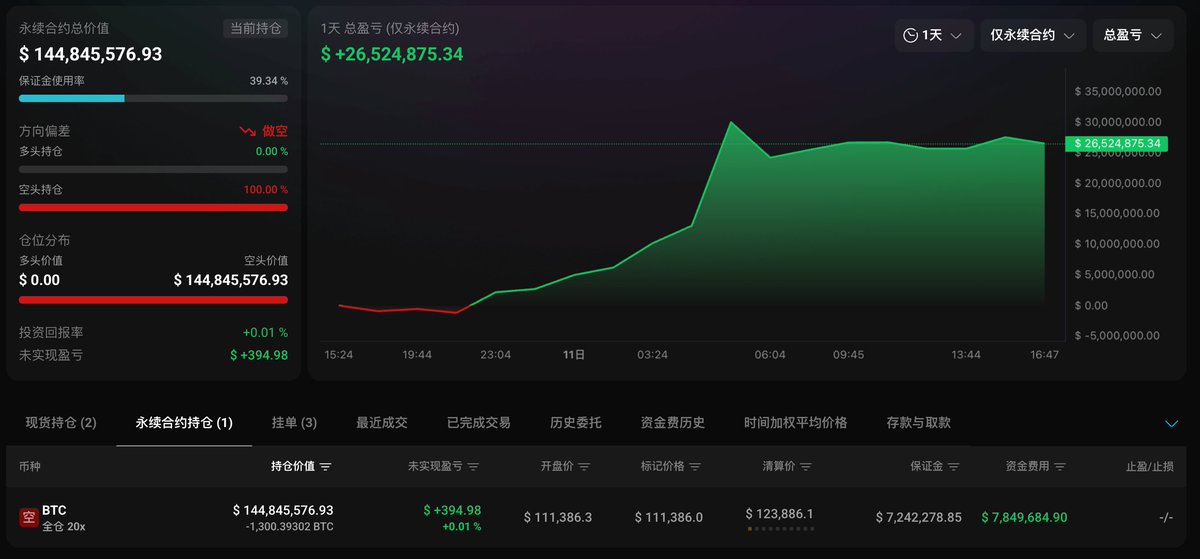 又一次见证「不下牌桌 + 坚定方向 + 钞能力」的力量✨ 还记得浮亏 2131 万美元那个「2025.03 以来连续四次做空 $BTC 的巨鲸」吗?扛单七个月坐了无数次过山车后,他终于等到那个历史性的 Timing 了 今早 BTC 最低跌至 10.2 万美金,使得他光速转亏为盈且 24 小时盈利高达 2652 万美金!目前他已止盈近 40% 的空头仓位,仍持有 1300 枚 BTC(1.44 亿美元) 传送门 👉 https://t.co/MdGdvtS866