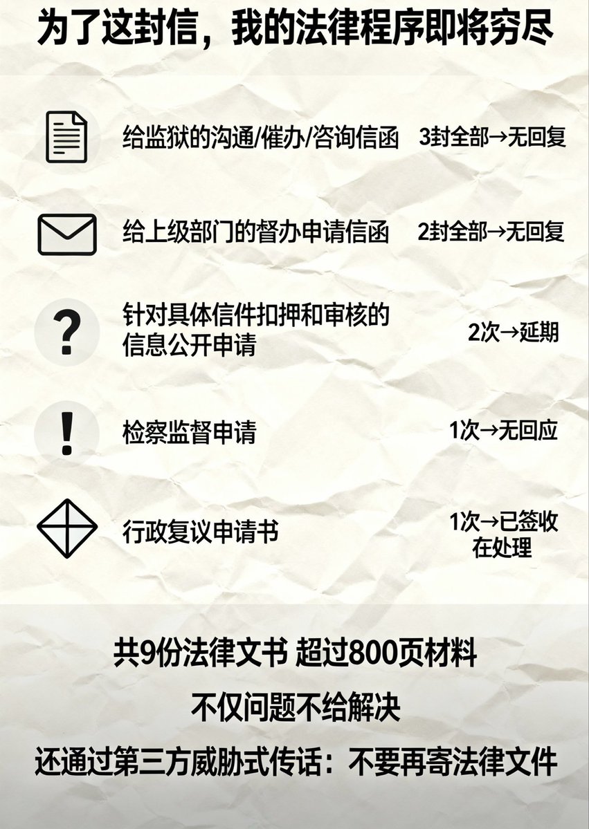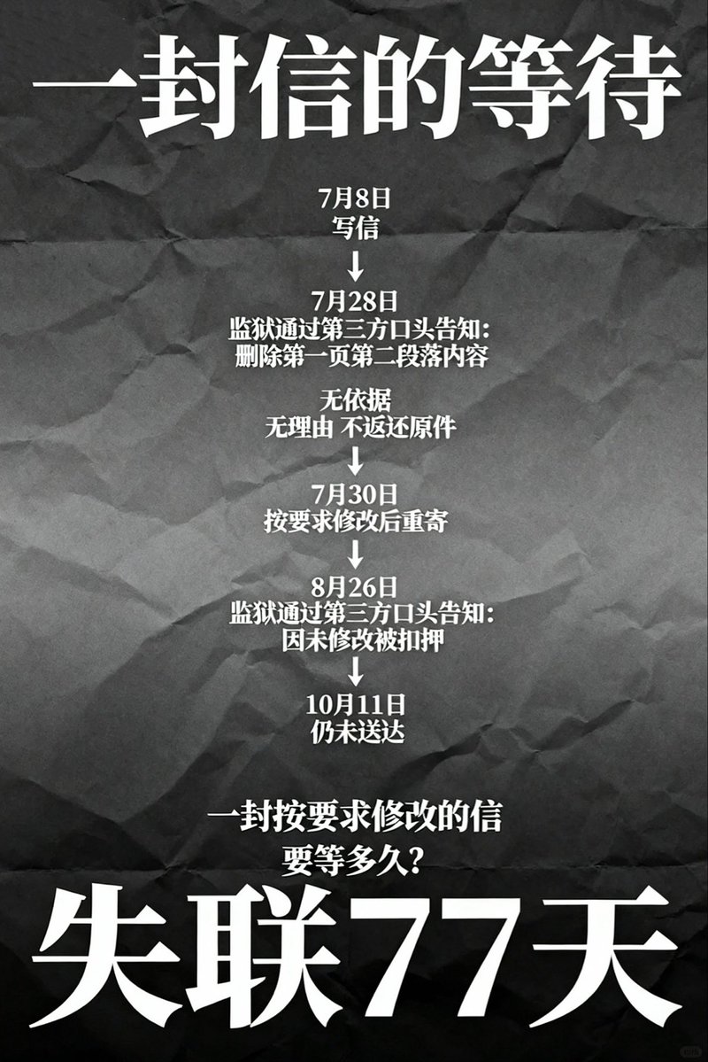 7月8日我写了一封信给许志永,7月30日按监狱要求修改后重新寄送,却被以“未修改”为由扣押至今。近2个月我几乎穷尽各种渠道,而我们两人也被中断通信近1个月了。我知道他承受的压力,也想让他知道我有多么努力。我还会坚持写信给他,直到恢复正常通信为止。一封信的等待: