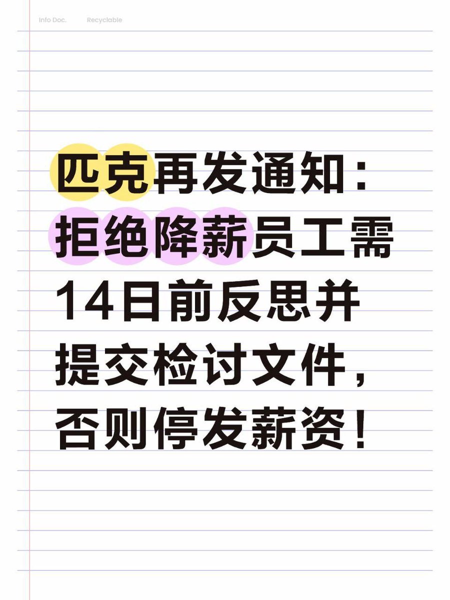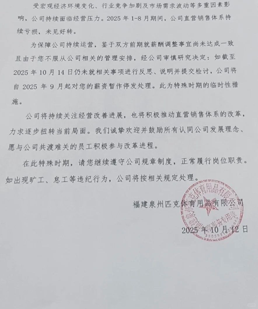 网友投稿,10月12日,匹克在发薪日口头通知降薪一事又有了新进展,匹克对拒绝降薪的员工发出通知,如果14号前员工不做反思并提交检讨文件,就要停发相关9月份的薪资。