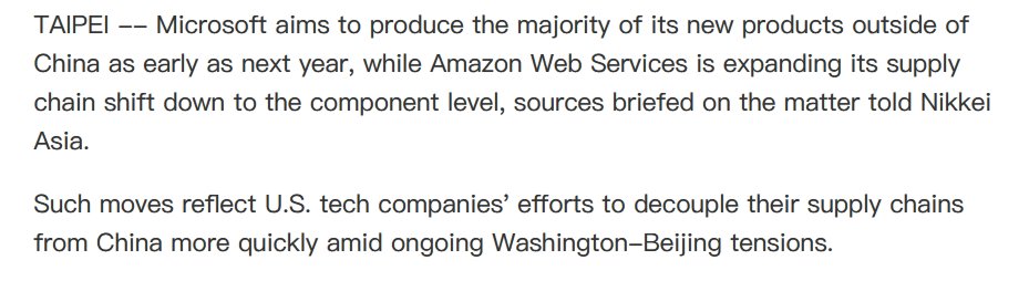 日经亚洲:微软计划最早明年在中国以外生产其大部分新产品。知情人士透露,知情人士称,微软已要求多家供应商帮助准备从明年开始将Surface笔记本电脑和数据中心服务器的生产“移出中国”,包括关键部件和组装。另有消息称,微软要求至少80%的服务器物料清单(BOM)来自中国境外。