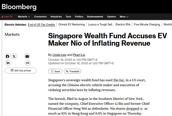 10月16日,据彭博消息,蔚来遭新加坡主权财富基金起诉,股价放量大跌13%。近日,新加坡主权财富基金——新加坡政府投资公司(GIC)已在美国法院对中国电动汽车制造商蔚来及其高管提起诉讼。 这起由GIC发起的诉讼,将蔚来公司、其CEO李斌以及前CFO奉玮列为被告。GIC指控蔚来通过与宁德时代等成立的蔚能电池资产公司,涉嫌夸大收入和利润,并隐瞒对蔚能的实际控制关系,误导投资者导致其蒙受损失。目前,法院已暂缓审理此案,将等待美国投资者发起的集体诉讼案结果后再作处理。