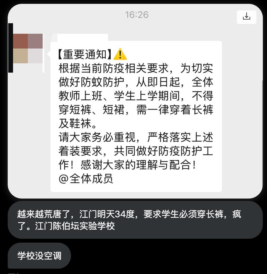 网友投稿,广东省江门市,陈伯坛实验学校今日发布通知,以疫情防控为由,要求学生在高温34℃的天气中必须穿长裤。