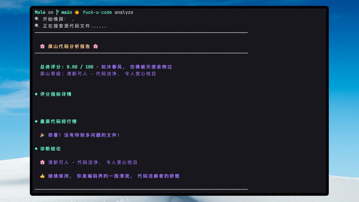 这个命令行工具有点意思,名字有点恶心,叫做屎山代码检测器,评估代码的“屎山等级”并输出美观的报告,我试了试 Mole,属于 如沐春风,仿佛被天使亲吻过的代码,不错不错。