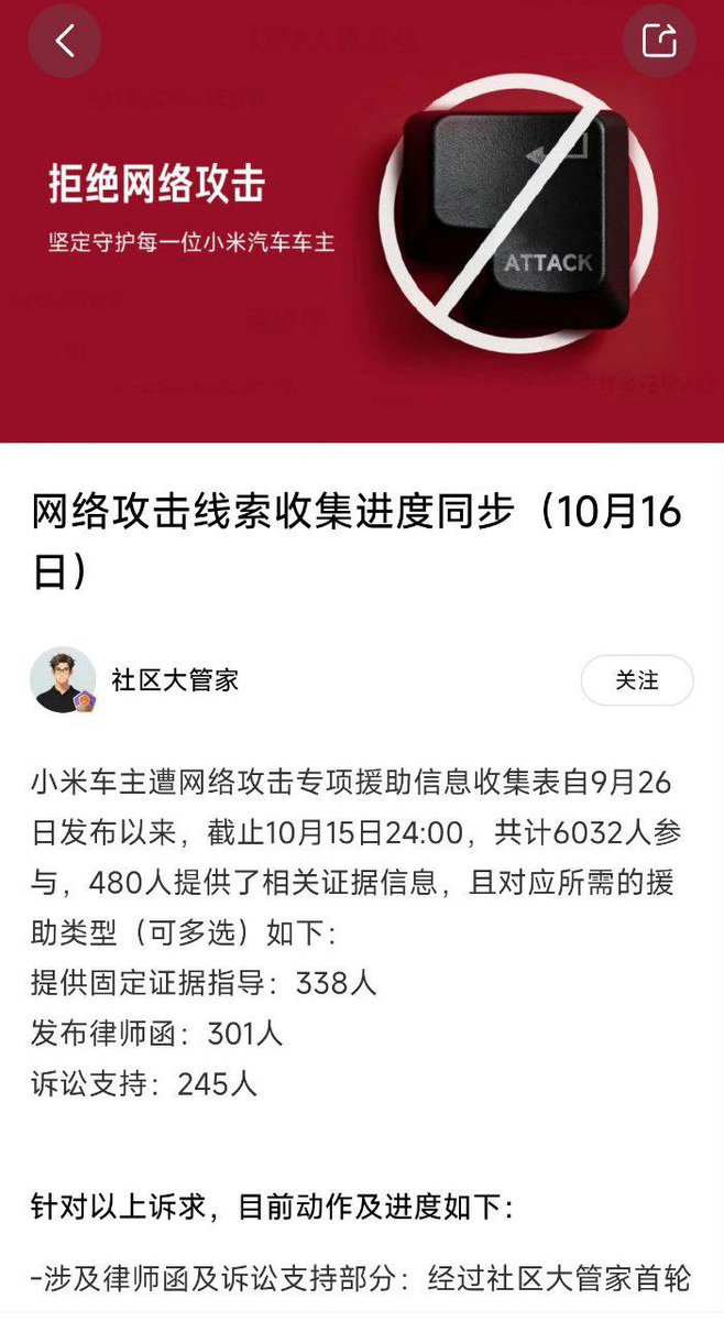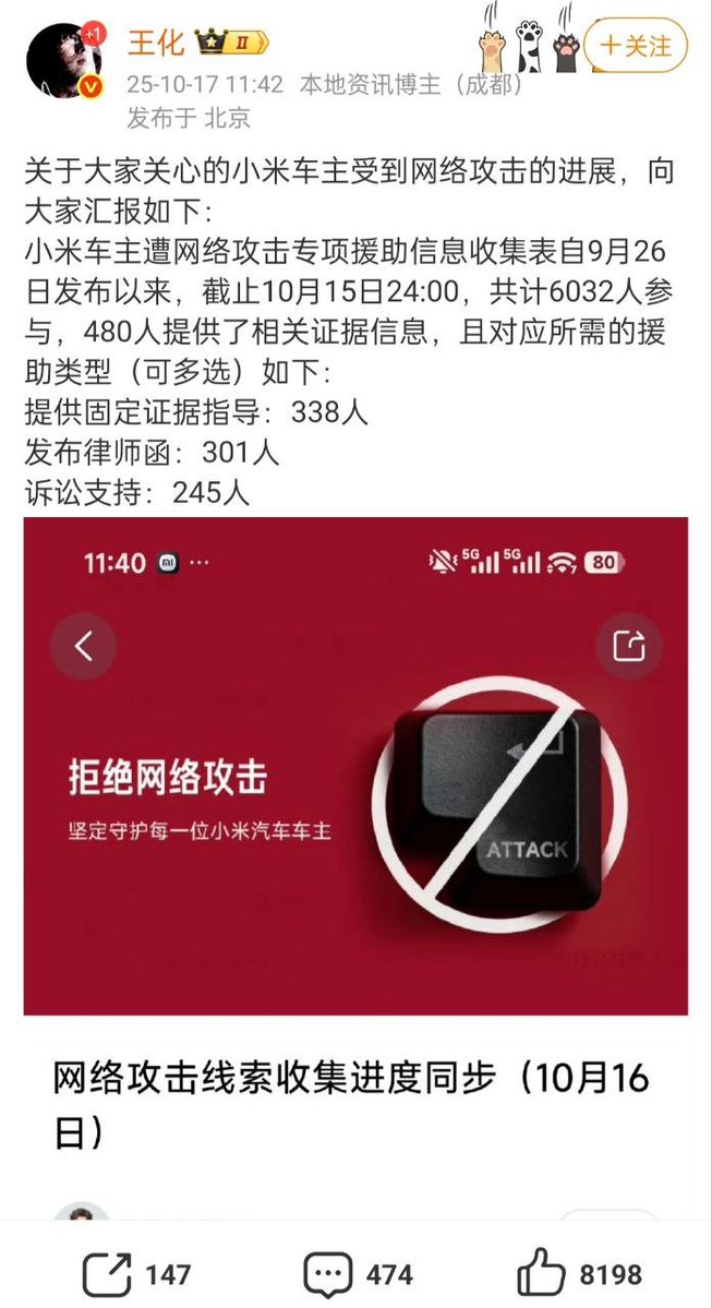 10月17日,小米公关部总经理王化发微博声称,关于小米车主拒绝网络攻击的进展情况,截至10月15日24时,已有超过6000人参与行动,480人提供了相关证据信息。