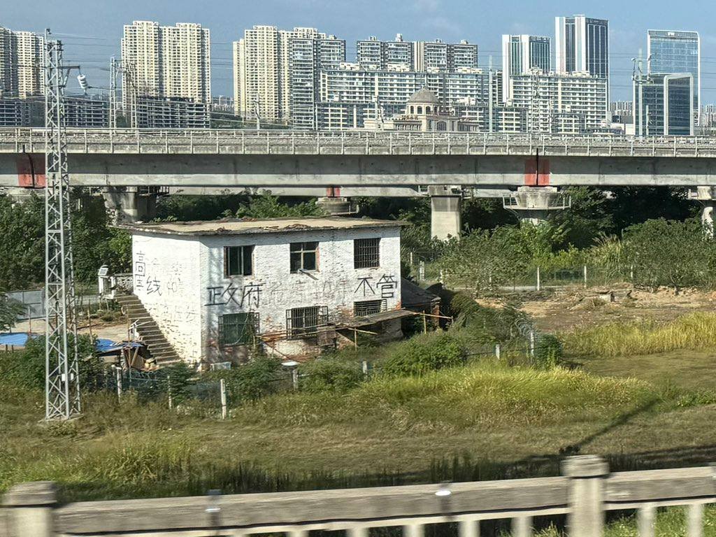网友投稿:江西省南昌市,南昌西站不远处的西北方向,出现了一处带有“政府不管”宣传标语的楼房,其中疑似包含“危房XX”字样,但该部分已被人为磨掉。