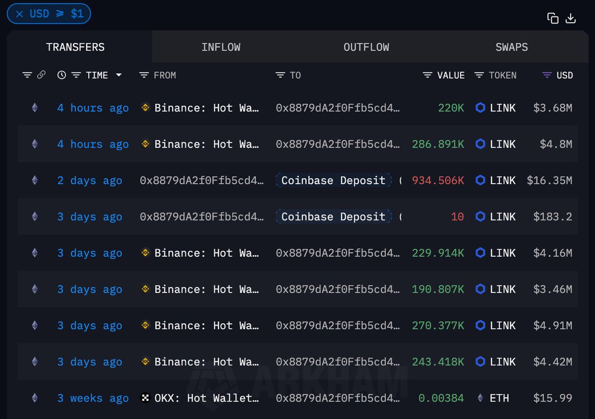 地址 0x887..D1914 又开始做 $LINK 波段了?🤑三天前他以均价 $18.13 囤积了 93.4 万枚 LINK(1694 万美元),前天下跌时 $17.5 充值进了交易所,若卖出将亏损 59.2 万美元;4 小时前他又从 #Binance 提出了 50.6 万枚 LINK(847 万美元),暂时无法判断是买回来的还是部分没有卖掉钱包地址