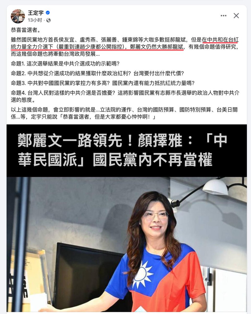 10月17日,民进党立法委王定宇发文指责大陆介选,他在脸书发文称,虽然国民党地方首长侯友宜、卢秀燕、张丽善、钟东锦等大咖多数挺郝龙斌,但是在中共和在台红统力量全力介选下,严重到连赵少康都公开指控,郑丽文仍然大胜郝龙斌。