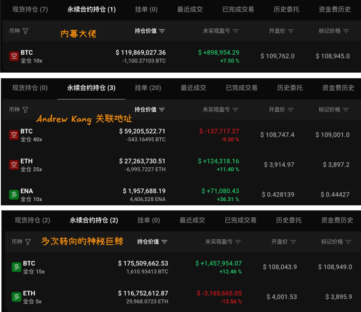 来梳理下 Hyperliquid 的三个大额热门仓位1️⃣ 内幕大佬,10.11 闪崩前开空获利 1.6 亿美元的巨鲸BTC 10x 空单价值 1.2 亿美元,目前浮盈 37 万美元线程指路 👉2️⃣ Andrew Kang 关联地址BTC & ETH 空单仓位价值 8683 万美元,目前浮亏 32.5 万美元线程指路 👉