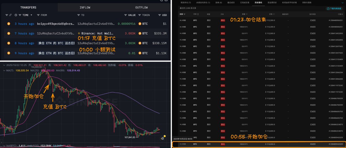 期间 BTC 币价从 $113000 跌至 $112300,加仓结束后到现在仅剩 ~$108500,距短期最高点回落 4.8%📉
